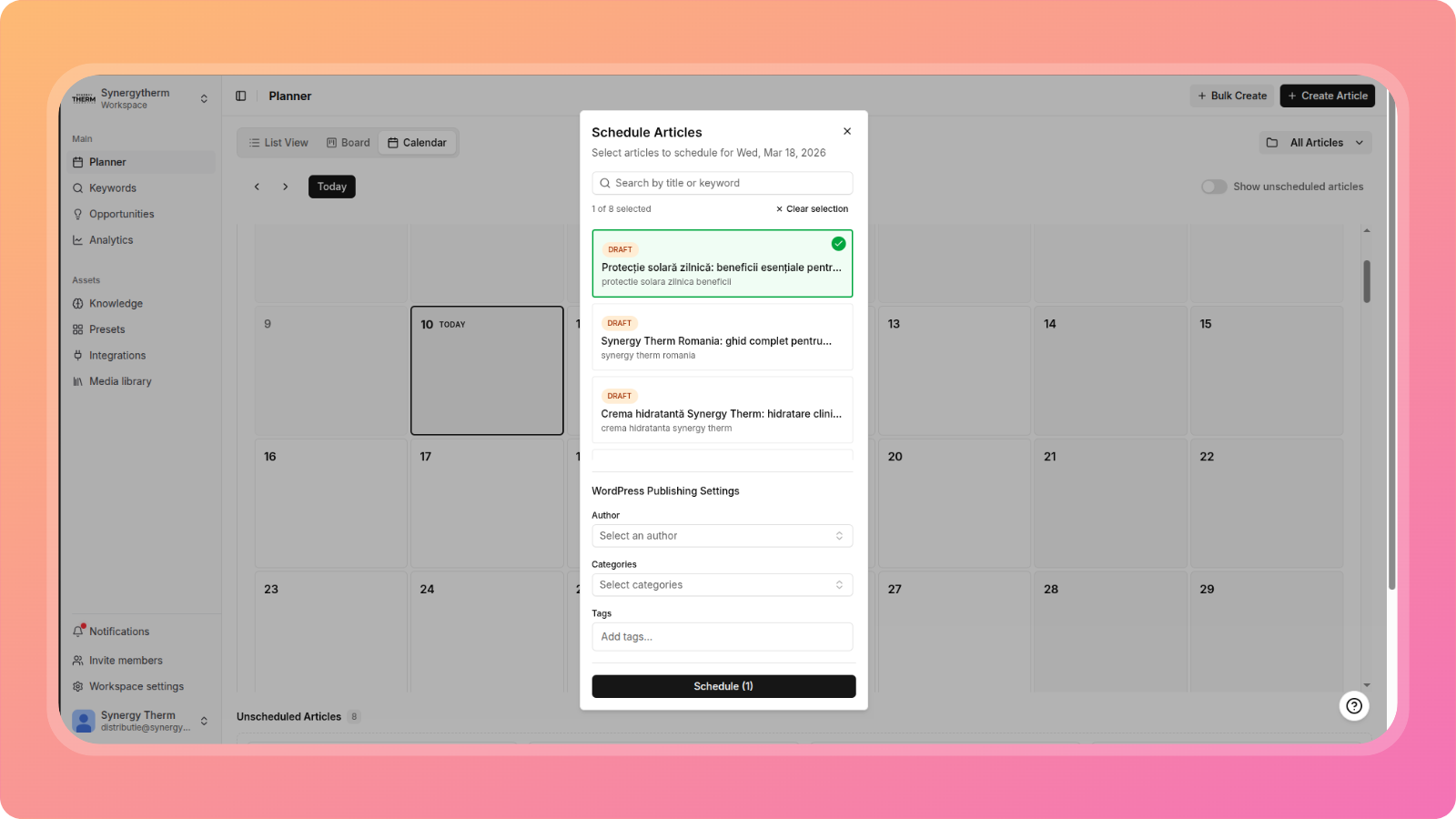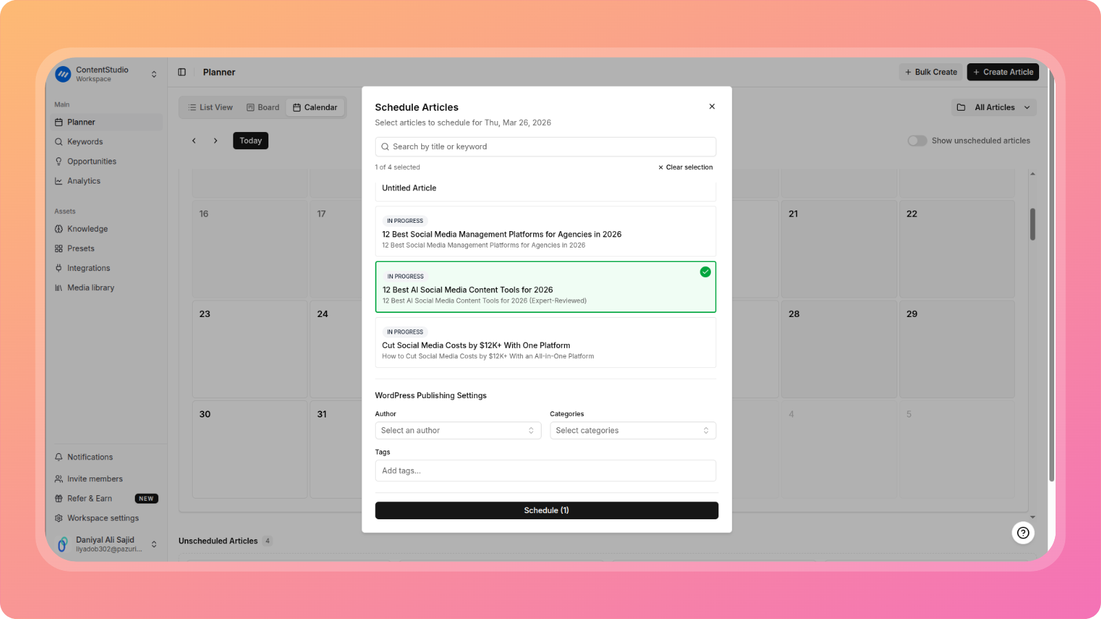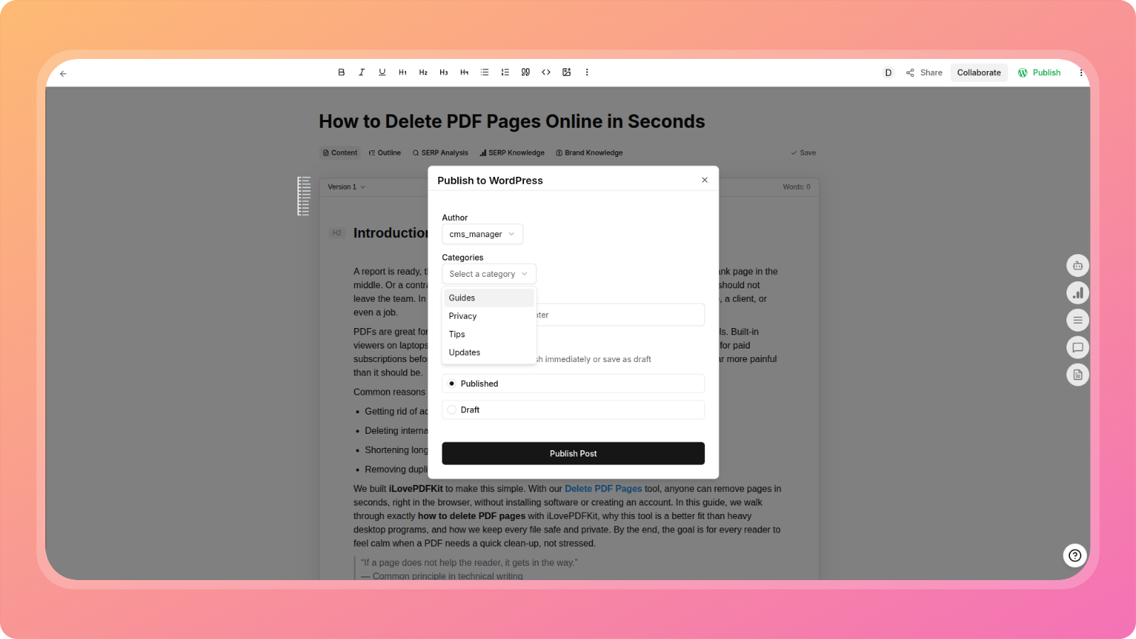 - Pre-filled WordPress Publishing - When updating an already-published article, the "Publish to WordPress" modal now pre-fills with your previous publishing settings (Author, Categories, Tags) for faster updates.