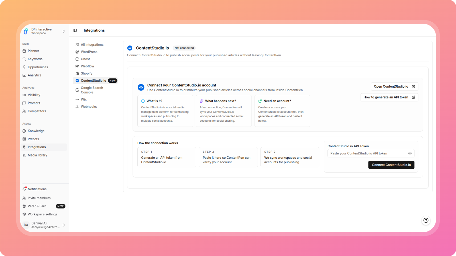 Amplify your content reach by publishing directly to social media! Connect your ContentStudio account to automatically share published articles across multiple social channels from inside ContentPen.