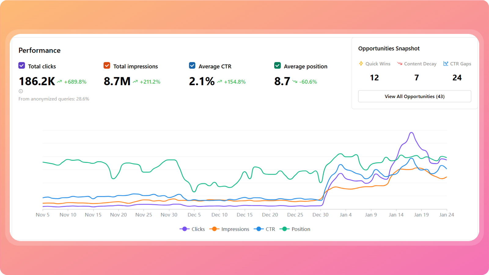 The Opportunities dashboard analyzes your search performance data to identify content that needs improvement.