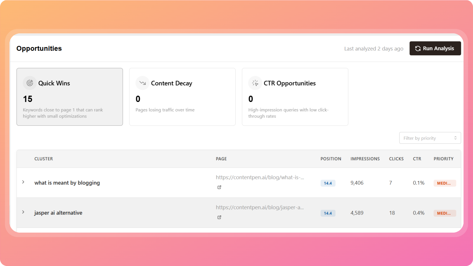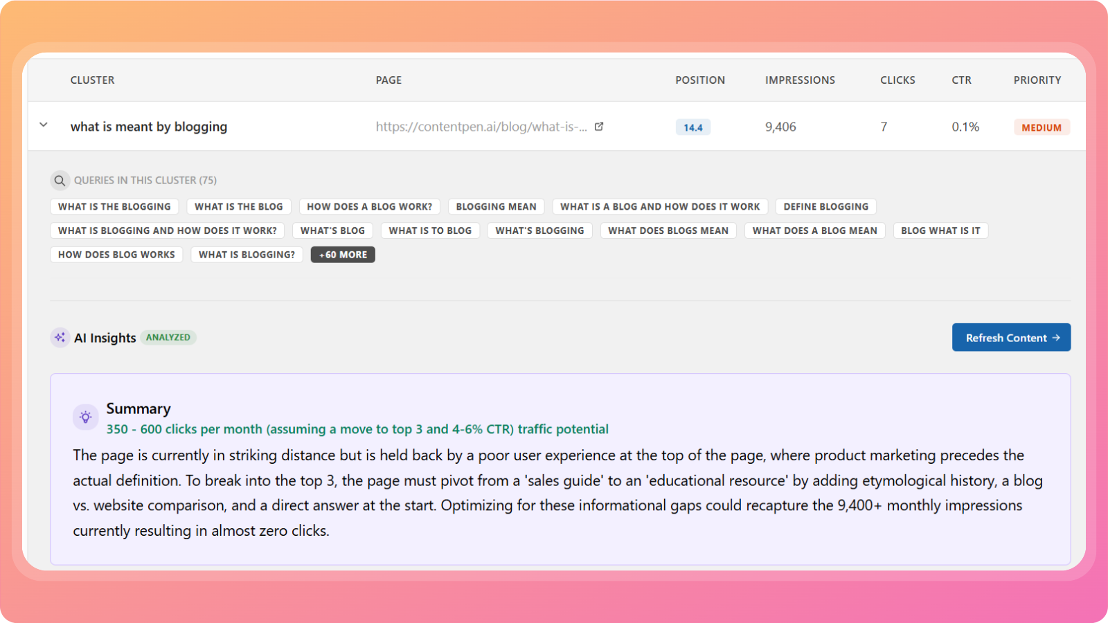 This release introduces deeper performance insights and actionable optimization workflows inside Contentpen.